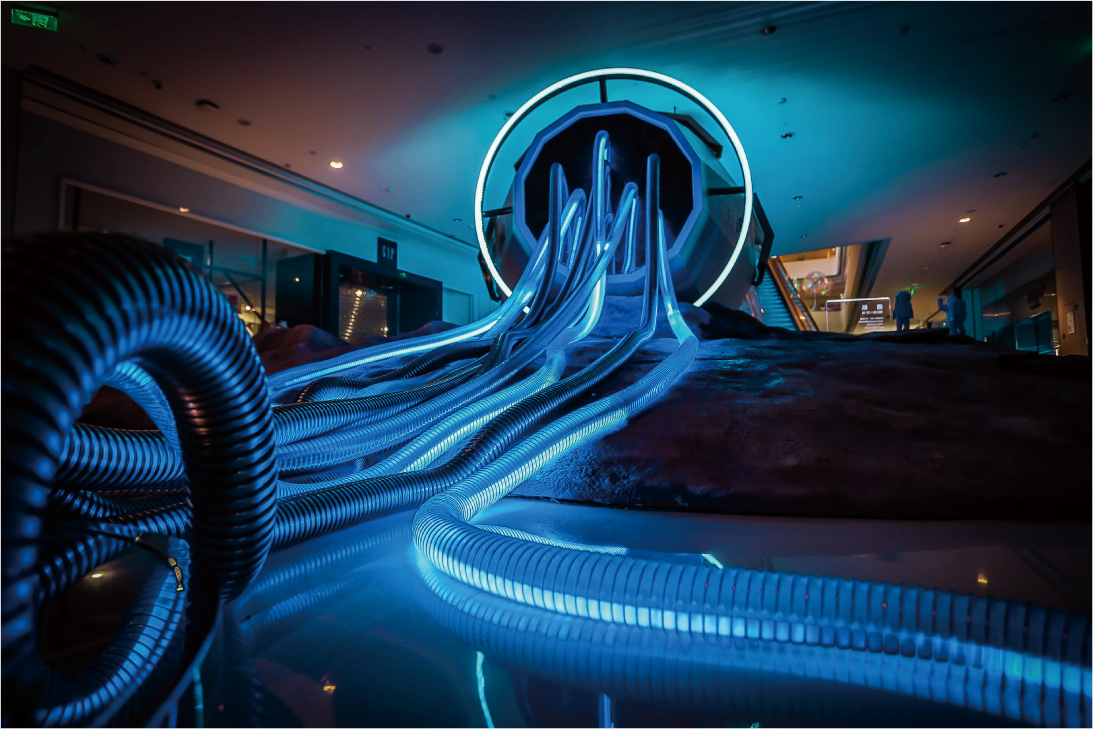 经典的太空火箭推进器造型,多组动态机械花组合成万花筒效果,不仅满足用户与花互动体验,配合烟雾、光电效果,更营造出赛博朋克超未来感。